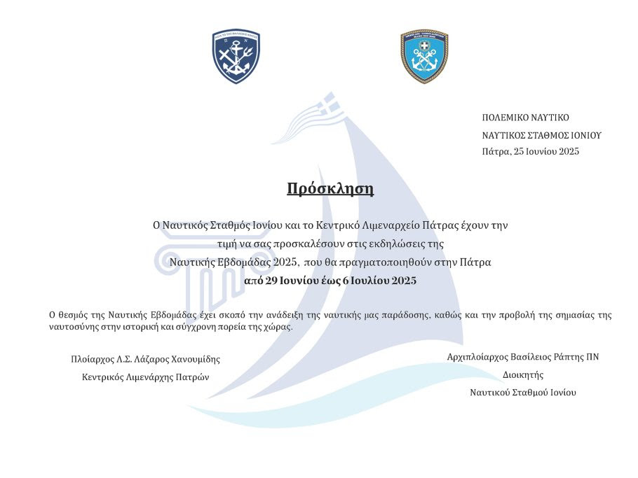 Περισσότερες πληροφορίες αναφορικά με την πρόσκληση και το συγκεντρωτικό πρόγραμμα της Ναυτικής Εβδομάδας 2025 μπορείτε να εντοπίσετε στον παρακάτω σύνδεσμο: https://www.upatras.gr/ekdiloseis-naftiki-evdomada-2025/ .