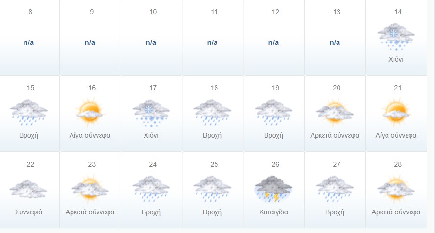 Αναφορικά με την μακροπρόθεσμη πρόγνωσή που κάνει το freemeteo, προβλέπονται αρκετές βροχές και λίγες χιονοπτώσεις. Συγκεκριμένα: