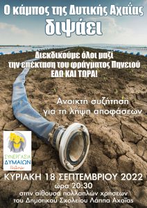 Ο επικεφαλής της «Συνεργασίας Δυμαίων Πολιτών», Φίλιππος Λιάκος απευθύνει ανοικτό κάλεσμα συμμετοχής, επισημαίνοντας: «Ο κάμπος της Δυτικής Αχαΐας «διψάει» και ενώ εδώ και χρόνια η λύση είναι δίπλα μας, δυστυχώς καθυστερεί, με ολέθριες συνέπειες για τον αγροτικό κόσμο του Δήμου μας.