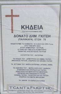 Θλίψη προκάλεσε στην κοινωνία της Πάτρας η είδηση του θανάτου του Δονάτου Γκίτση. Ο εκλιπών έφυγε από τη ζωή σε ηλικία 78 ετών και ήταν γνωστός από την ενασχόλησή του με την εστίαση, καθώς διατηρούσε την ταβέρνα Μουριές στα Ζαρουχλέικα. Η κηδεία του θα γίνει το Σάββατο στις 3 το μεσημέρι από τον Ιερό Ναό του Αγίου Δημητρίου στην Πάτρα και η ταφή θα γίνει στο κοιμητήριο της Παναγίας της Αλεξιωτίσσης.