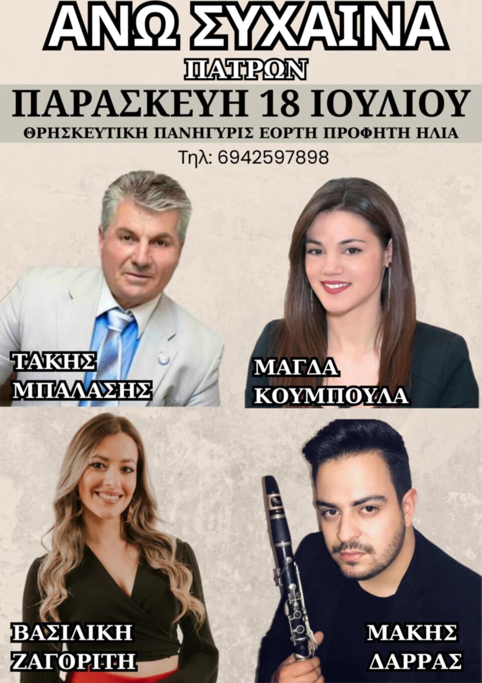 Το γλέντι θα συνεχιστεί με τον Τάκη Μπαλάση,την Μάγδα Κούμπουλα και την Βασιλική Ζαγορίτη στο τραγούδι. Στο κλαρίνο ο Μάκης Δάρρας.