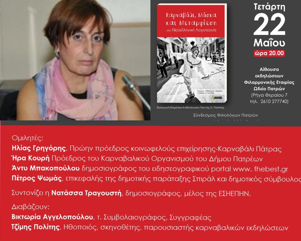 Ως γνωστόν,  ο Σύνδεσμος Φιλολόγων Πατρών, η Φιλαρμονική Εταιρία Ωδείο Πατρών, οι Εκδόσεις 24 γράμματα καιι το ηλεκτρονικό λογοτεχνικό περιοδικό Διαπολιτισμός, παρουσιάζουν το βιβλίο Καρναβάλι-Μάσκα και Μεταμφίεση στη νεοελληνική λογοτεχνία.