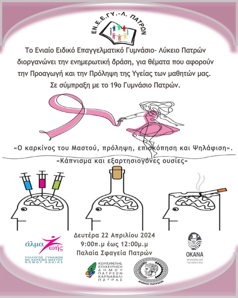 Ενημερωτική δράση που αφορά πρόγραμμα Προαγωγής και Πρόληψης Υγείας με τη συμμετοχή 40 μαθητών διοργανώνει το Ενιαίο Ειδικό Επαγγελματικό Γυμνάσιο-Λύκειο Πατρών σε σύμπραξη με το 19ο Γυμνάσιο Πατρών τη Δευτέρα 22 Απριλίου και ώρα 9πμ στις αίθουσες Καρναβαλιού (Κ6) και Καραγκιόζη (Κ7) του πολυχώρου των Παλαιών Σφαγείων.