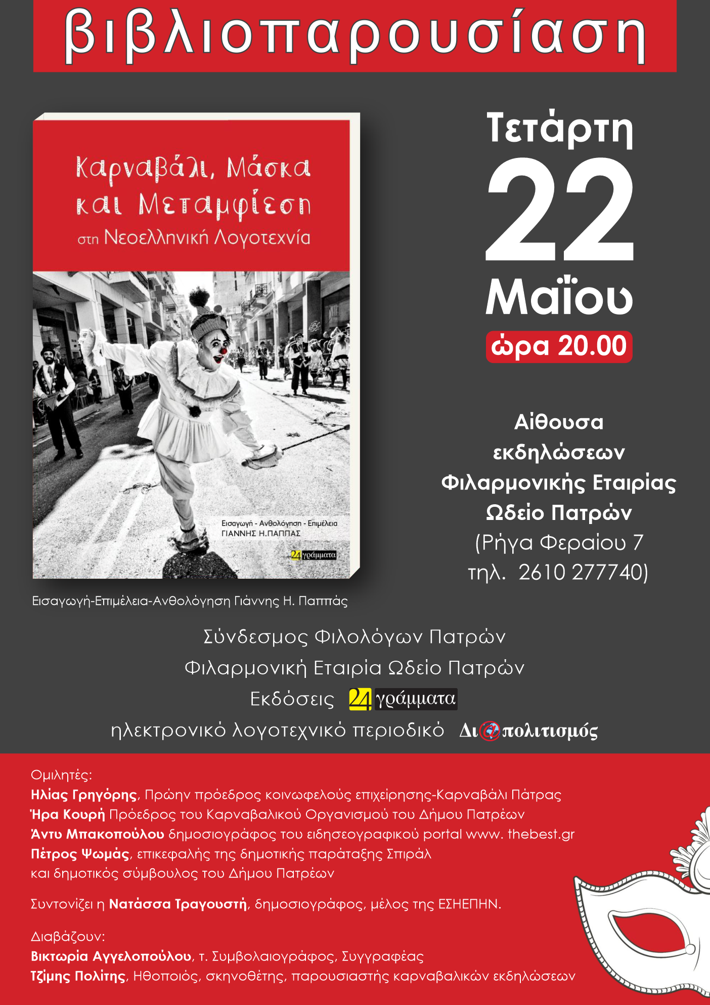 Η εκδήλωση θα πραγματοποιηθεί την Τετάρτη 22 Μαΐου 2024 και ώρα 20.00 μμ στην αίθουσα εκδηλώσεων της Φιλαρμονικής Εταιρίας Ωδείο Πατρών