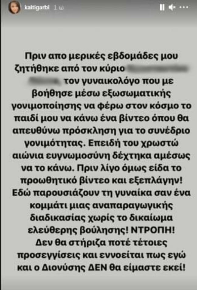«Πριν από μερικές εβδομάδες που ζητήθηκε από τον γυναικολόγο… που με βοήθησε μέσω της εξωσωματικής γονιμοποίησης να φέρω στον κόσμο το παιδί μου, να κάνω ένα βίντεο όπου θα απευθύνω πρόσκληση για το συνέδριο γονιμότητας. Επειδή του χρωστάω αιώνια ευγνωμοσύνη, δέχτηκα να το κάνω. Πριν από λίγο όμως, είδα το προωθητικό βίντεο και εξεπλάγην. Εδώ παρουσιάζουν τη γυναίκα σαν ένα κομμάτι της αναπαραγωγικής διαδικασίας χωρίς το δικαίωμα ελεύθερης βούλησης. Ντροπή! Δε θα στήριζα ποτέ τέτοιες προσεγγίσεις και εννοείται πως εγώ και Διονύσης δεν θα είμαστε εκεί.”